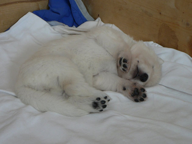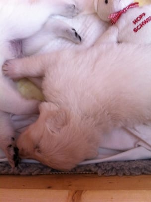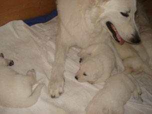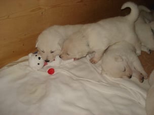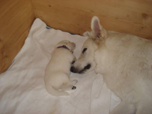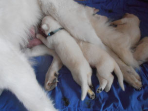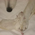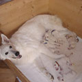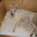 Die Mädchen liegen satt und wohlig in der Kiste und ihre Mutter lässt sie kaum aus den Augen. In der Nacht schlafe ich ja neben der Kiste und sie lassen mich wirklich schlafen. Zuerst gluck gluck und nachher einfach ruhe, Estella ausgestreckt und zufrieden bei ihnen. Nach 4 stunden wiederholt sich das ganze. Dann gehe ich mit Estella kurz nach unten, sie bekommt dann noch ihre Welpenmilch mit Quark. Dann wieder ruhe bis am morgen.